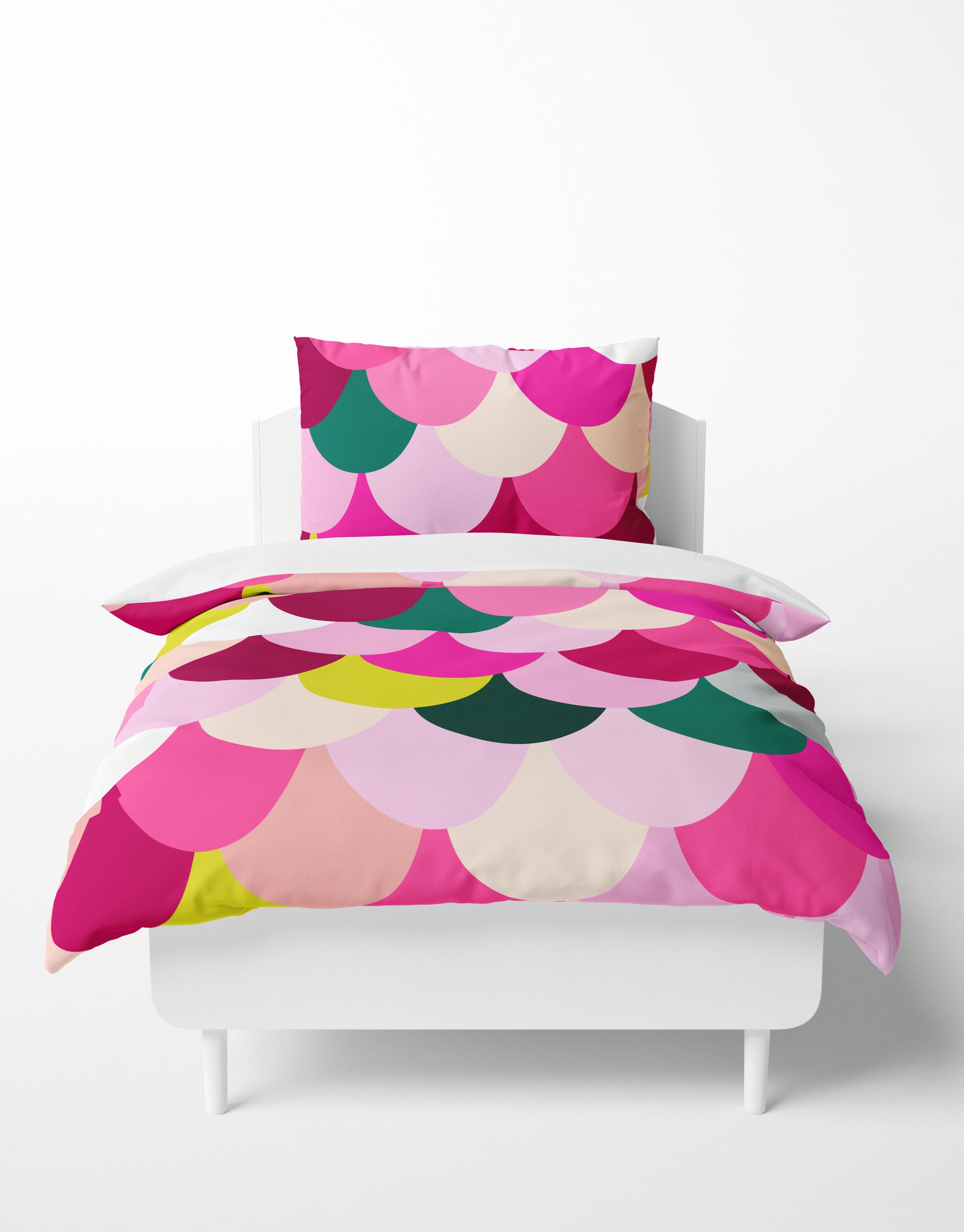 Toddler, single and three quarter bedding come with a single standard pillowcase. Double, queen, king and super king bedding come with two standard pillowcases. All of our bedding sets have matching framed prints and wall stickers.Â